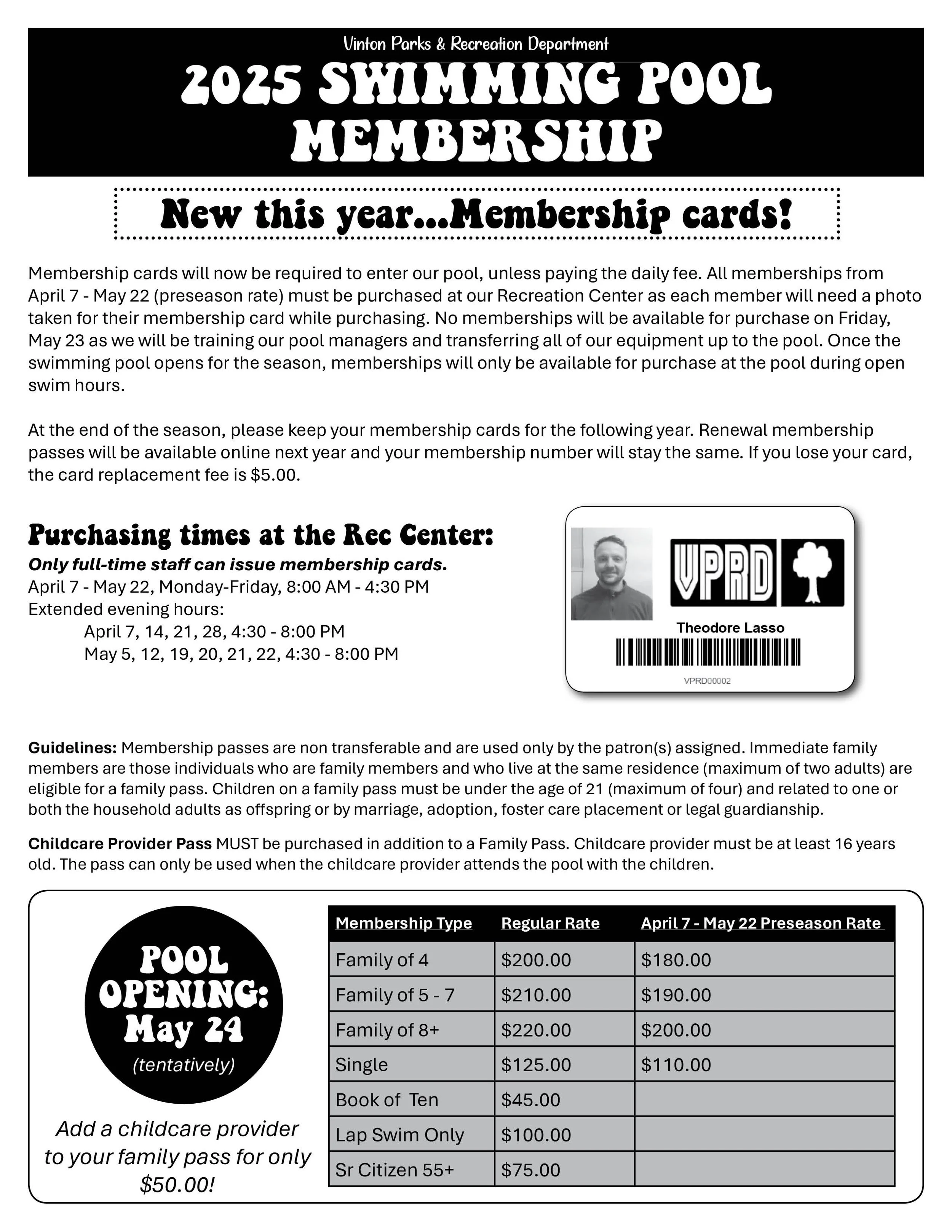 Childcare Provider Pass MUST be purchased in addition to a Family Pass. Childcare provider must be at least 16 years old. The pass can only be used when the childcare provider attends the pool with the children.